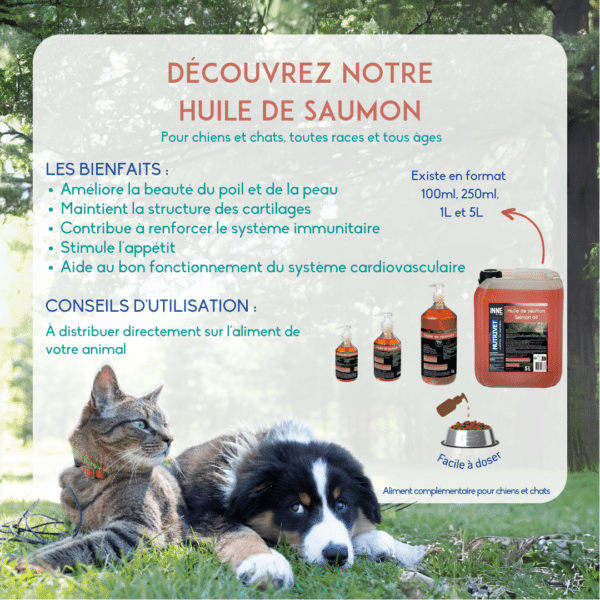 Découvrez notre Huile de saumon Inne, garantie en Oméga 3 et 6. Elle présente de nombreux bénéfices pour votre animal : beauté du poil et de la peau, renforcement du système immunitaire en période de froid, maintien de la structure des cartilages, stimulation de l’appétit et aide au bon fonctionnement du système cardiovasculaire.